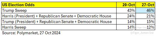 博彩网站Polymarket的数据显示,共和党大胜的几率从10月20日的43%提升至10月27日的46%。而在2016年,共和党在参众两院及总统选举中均取得大胜,随后标准普尔500指数在选举日(11月8日)至年底期间上涨了5.4%。