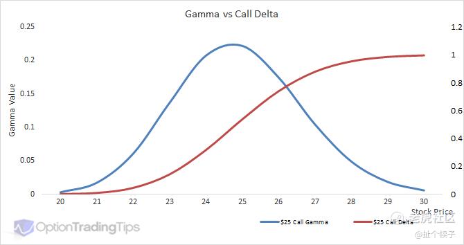 物理比较好的同学也可以把Delta和Gamma的关系理解为速度和加速度之间的关系。Gamma在期权at the money(行权价=股价)的时候最大,行权价距离股价越远,Gamma越小。