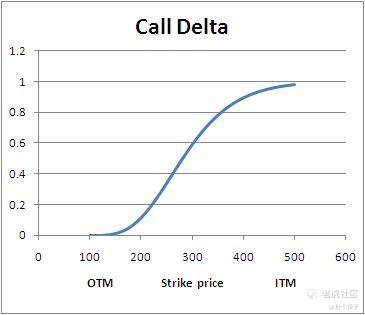 如上图所示,delta随着正股股价的变动呈一个“S”型函数,股价越接近行权价(Strike price),Delta越接近0.5,一般称为“中性delta”。