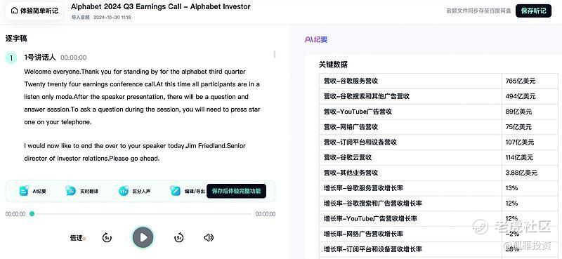 百度网盘「简单听记」AI纪要链接(谷歌Q3电话会):https://pan.baidu.com/embed/listenshare?note_id=34547&uk=3400024655