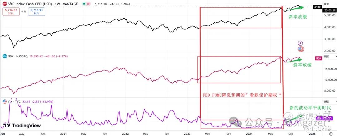 低波动率场景得益于——财报韧性消化美股的EPS(分子端),叠加FED降息预期(分母端)。