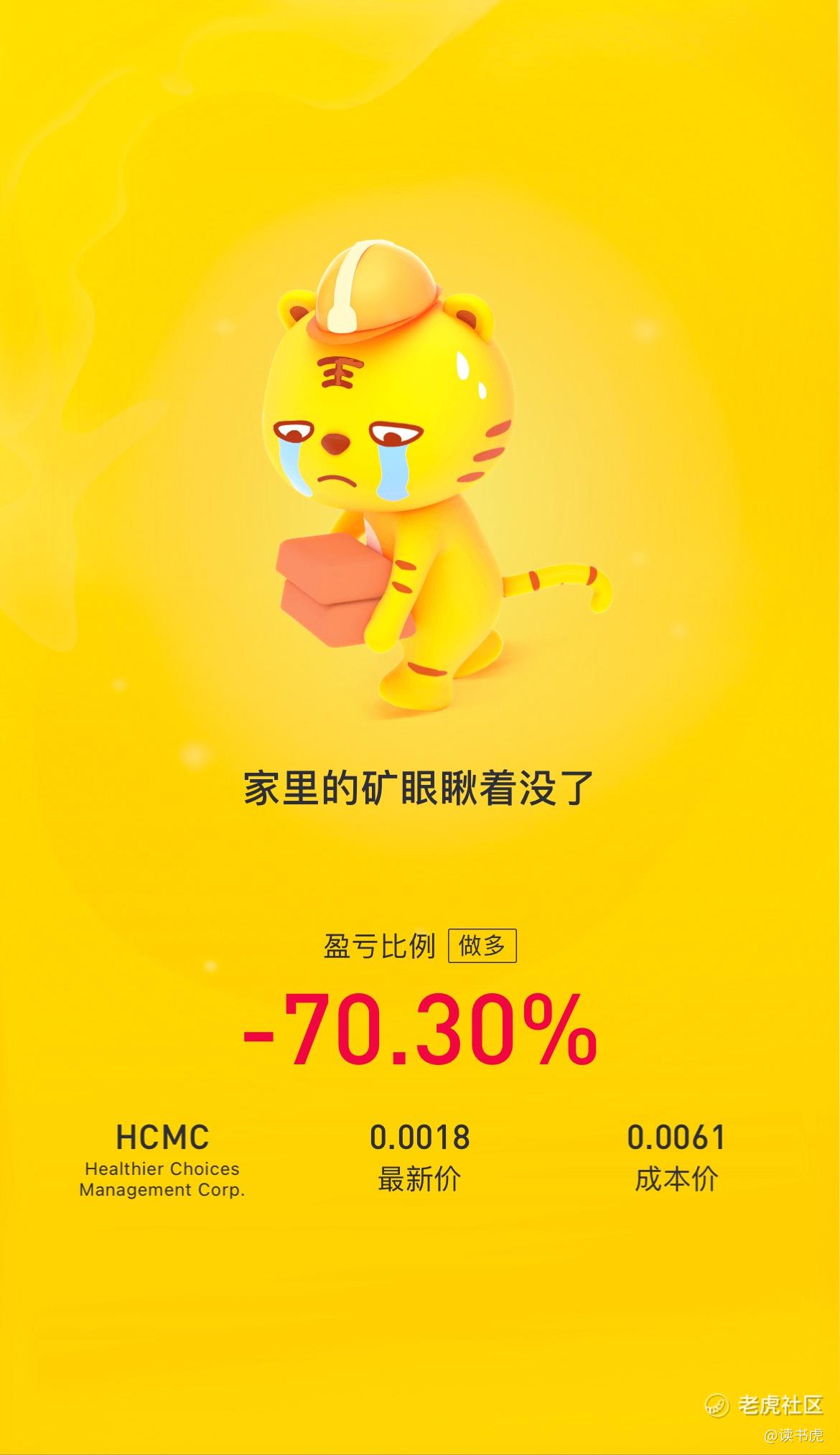 HMNY,你们是后来才玩美股的,开始最初的一批人,多少人抄底HMNY?股价从999999美金一直跌,跌到300就有多少人坐不住了,100多少人加仓,20多少人加仓,当时社区全是晒亏损截图的,都当其股票不存在了,全都是—99%的。我是1.2进了10手,0.6加了100手,0.06加了300手,最后平了