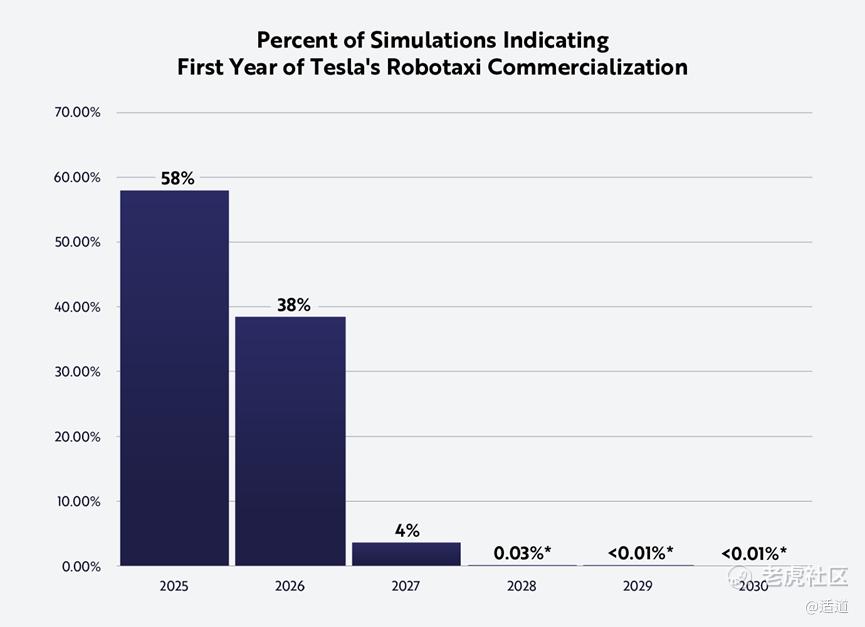 特斯拉在今后2年内推出Robotaxi服务的概率很大,不能在未来5年推出Robotaxi服务的概率微乎其微,如下图所示。