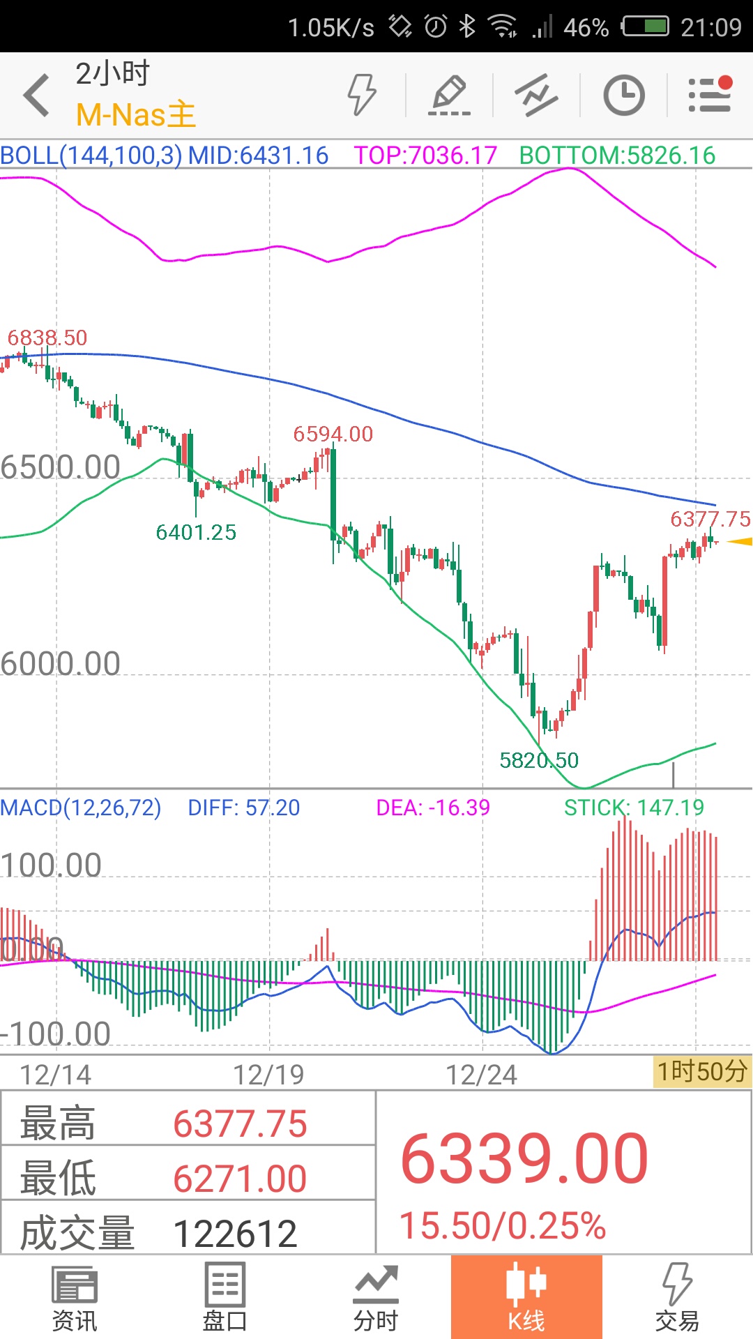 昨天强调了纳斯达克期货的极限高度是120分钟级别布林中轨动线(昨天是6460点)现已下降至6435点。