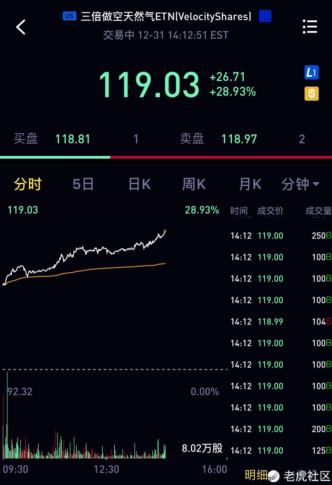 经历了一个半月的等待,本人于2018年11月15日预测的DGAZ第一目标118.40于2018年最后一个交易日顺利实现。[得意][得意][得意]