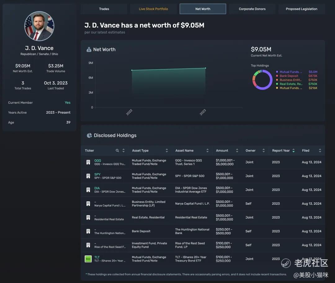 特朗普竞选搭档J.D. Vance从铁锈区平民翻身成为未来的美国副总统,这样有能力的人想必在投资领域也会有不少收获。