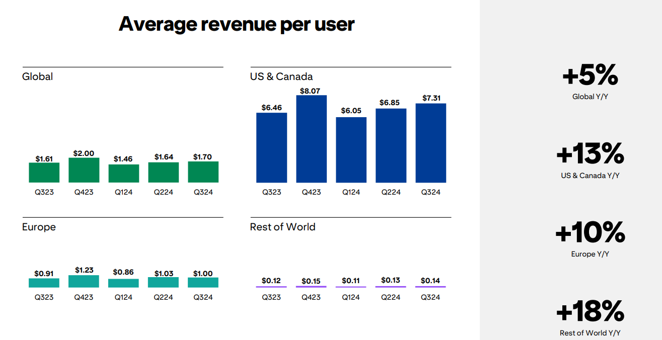 月活跃用户增长主要来自海外。美国/加拿大的MAU至9900万,仅增长3%;欧洲的MAU为1.39亿,增长8%,其他地区增长16%至3亿。