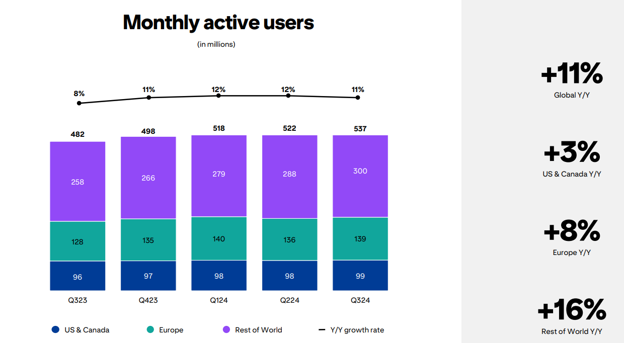 全球月活跃用户增长11%至创纪录的5.37亿。