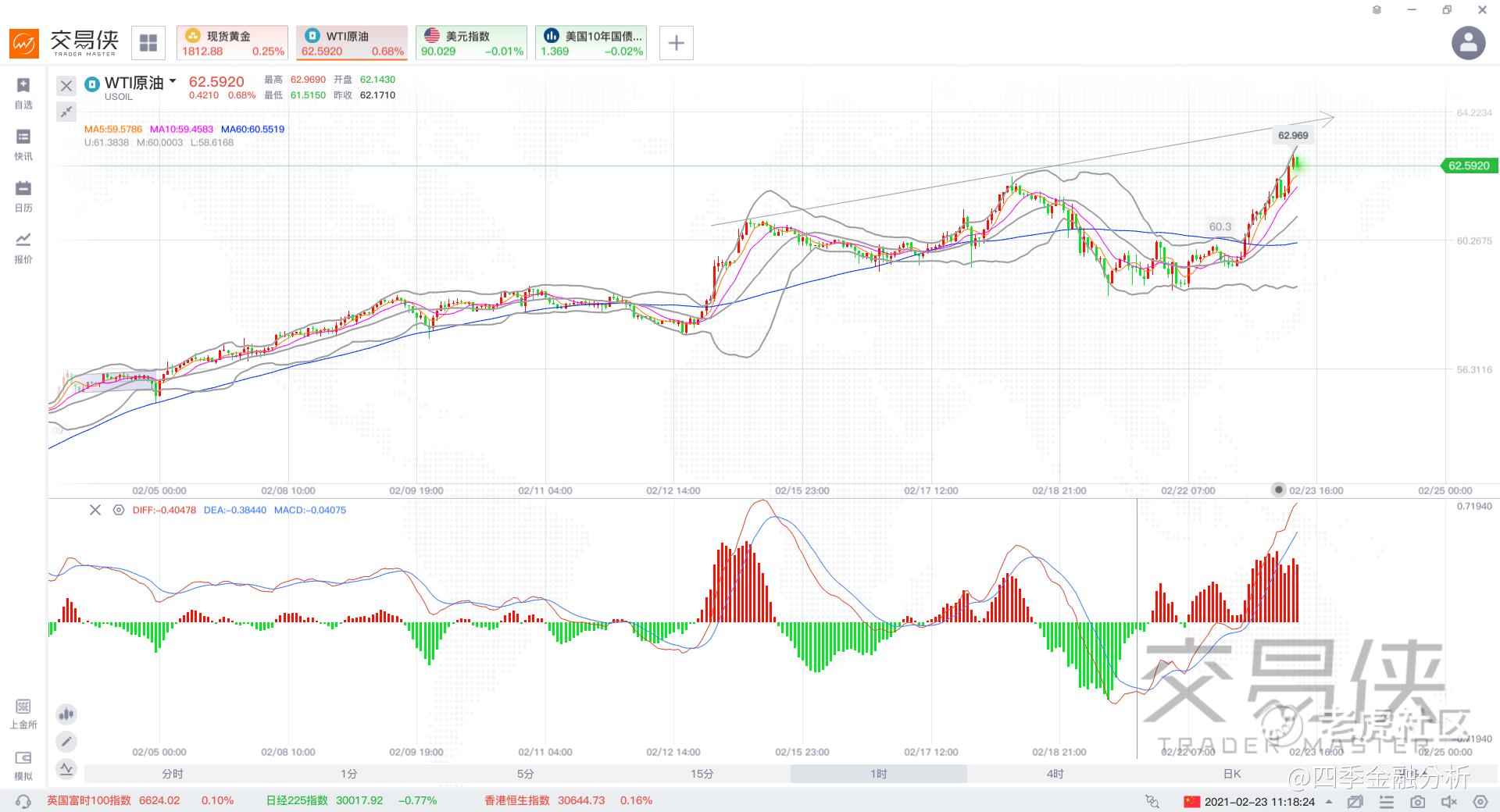 我今天真的很感谢原油的上涨,让我不必承受太大的压力,昨天我给的点位其实很保守,就怕达不到目标被喷,原油可谓是超额完成了我的预期,收盘于62.1,今日开盘继续发力,创下新高62.96。1小时级别,K线成功越过MA60,沿着布林带上轨不断上升,多头多的不能再明显了,布林带开口向上,上轨被打开,上涨趋势线表明K线还有到达63的希望,MACD快慢线非常强势,红色动能柱能量足,今日我也只看多。