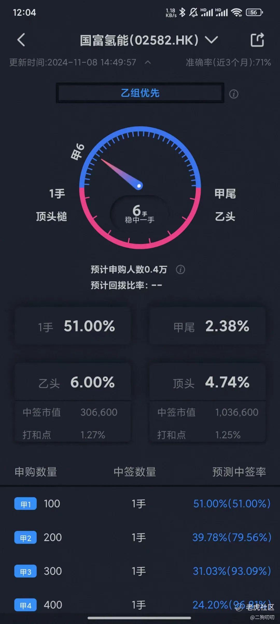 香港公开发售60万股,每手100股,合计6000手,目前孖展只有不到5倍,这目前这个情况,想超过15倍应该是没啥戏了,不回拨,那么甲乙组各获3000手,按照4000人申购,预计1手中签率在51%,申购6手稳中一手。