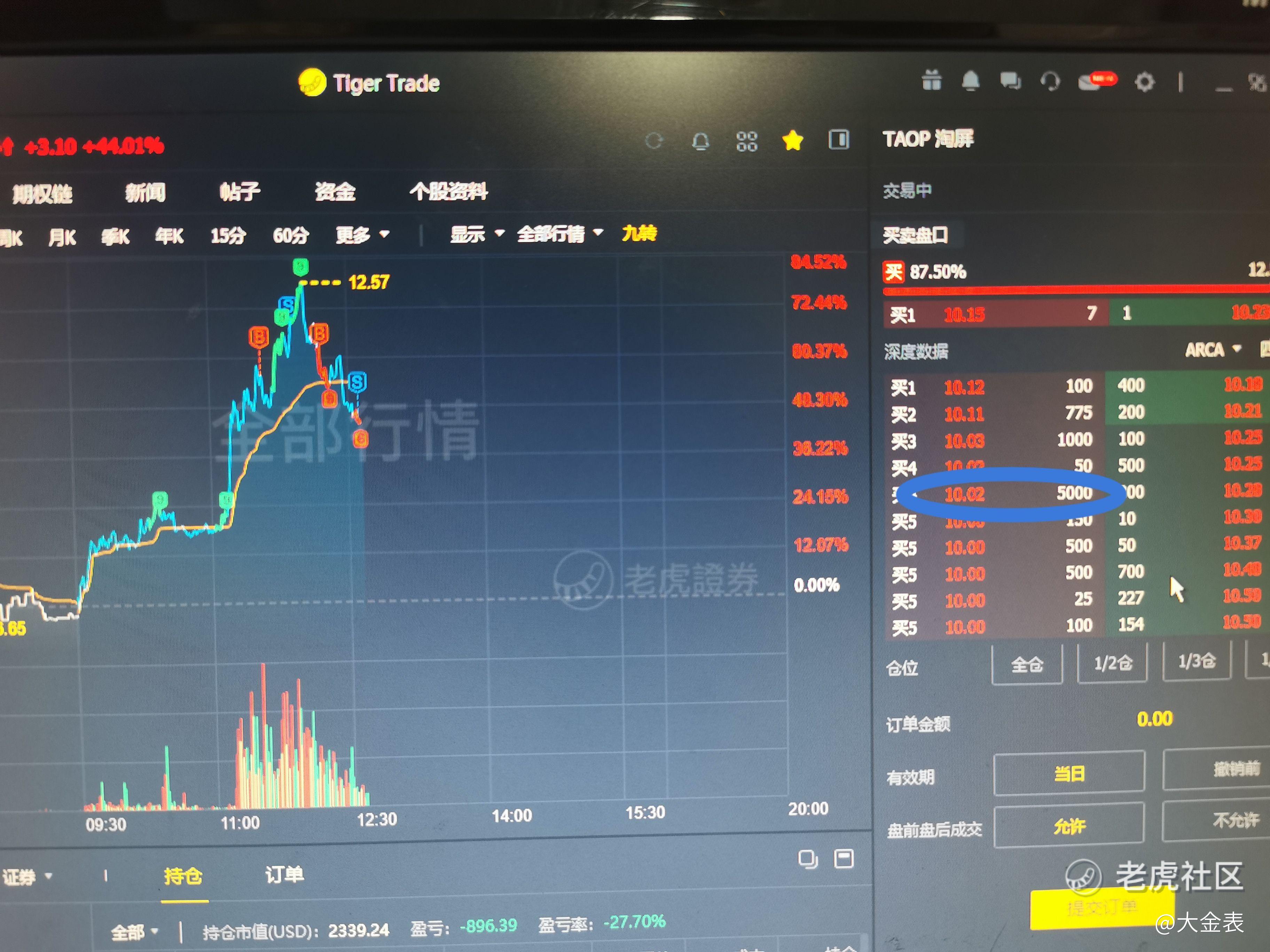 $淘屏(TAOP)$这个庄很贪,而且没耐心,只要有大单挂,就会扭扭捏捏的降到大单价,观察了1个多小时。有一笔1.7万股的大单庄家稍微诱了一下看别个不上当,1分钟的时间就降价。辛好只是小买了一点做试探。果然几次都被我猜中。只是道行还不够深,猜不中庄家诱多的决心