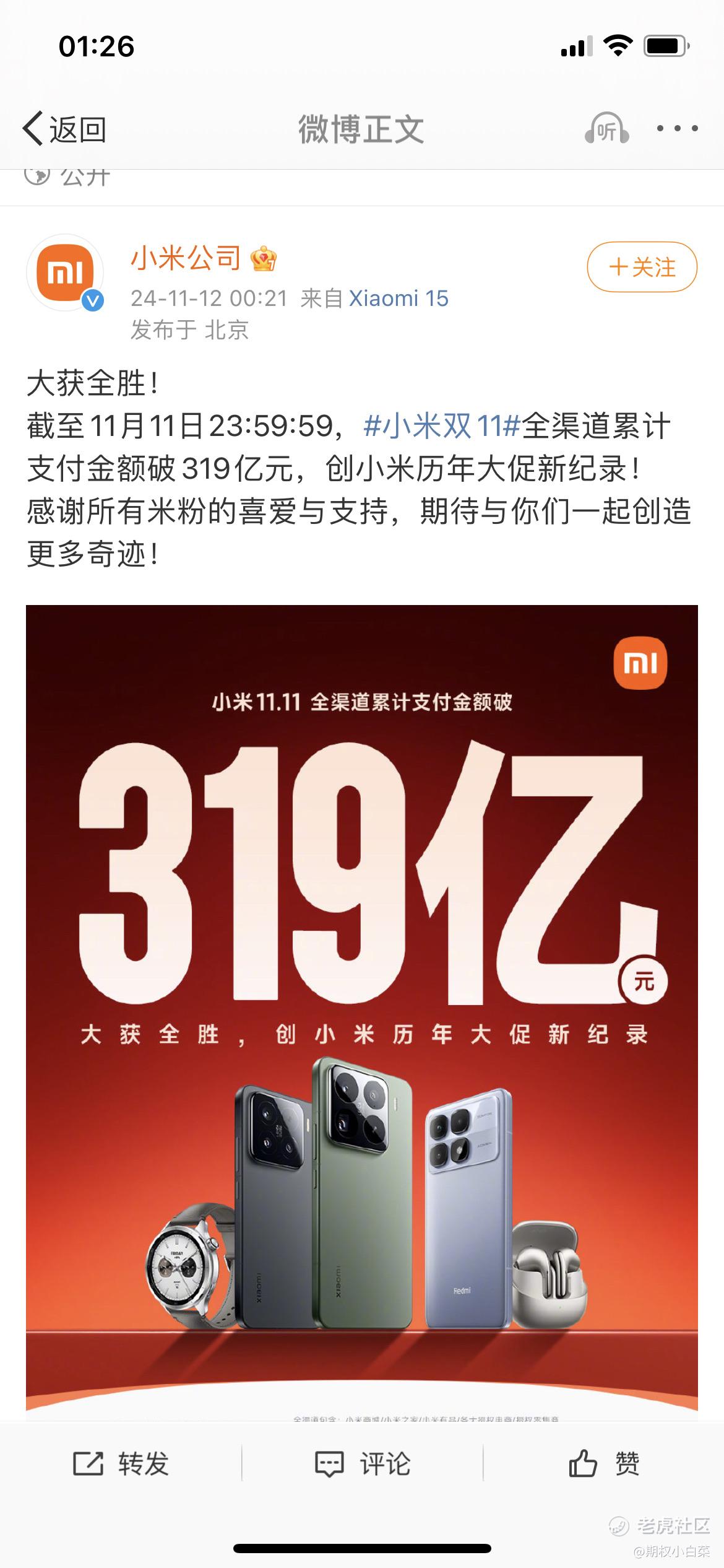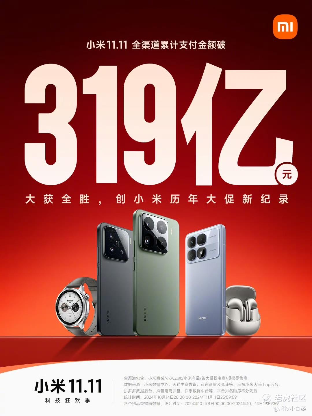 截至11月11日23:59:59,#小米双11#全渠道累计支付金额破319亿元,创小米历年大促新纪录!