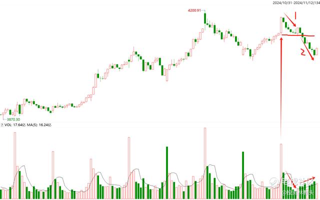沪深300相比之下还好一点,交易量比昨天略大,是一个下砸的态势,从15分钟图来看,今天沪深300的走势也并不乐观。之所以还在高位,是开盘的时候有大资金进来,表现为早上刚开盘时候的大阳线,但这根大阳线没有建立信仰,就开始有人抛售了。下图①这个波段是缩量下跌的,虽然有人抛售,但跟随者不多,甚至在支撑位还有一个小阳线准备反弹。