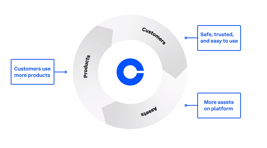 通过各种方式吸引更多的用户进入Coinbase平台,为这些用户提供更多更好的加密资产,围绕这些加密货币提供更多的产品和服务,从而进一步吸引更多用户来到这个平台——这就是Coinbase的增长飞轮。