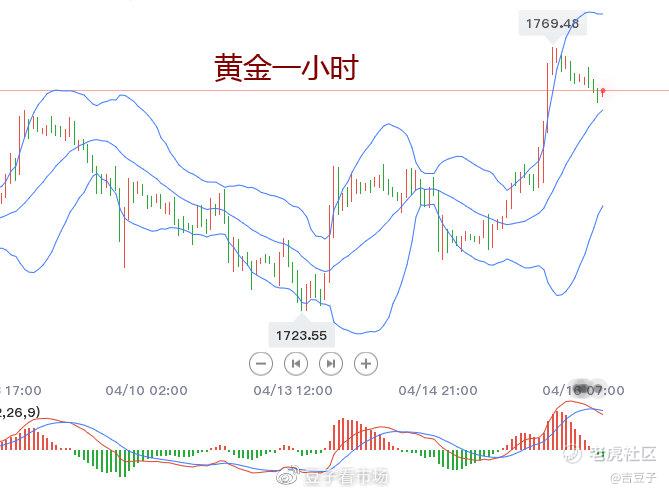 图为黄金一小时级别。昨晚攀高至69附近开始回落,现价61,布林带中轨57,macd空头开始放量,对应69高位回调。日内没什么好思路,白盘波动应该不大,主要等晚上美盘,日内会迎来小幅回调,那这就是给接多的机会,关注57和50附近,都是进多的机会,止损带在45之上都可。