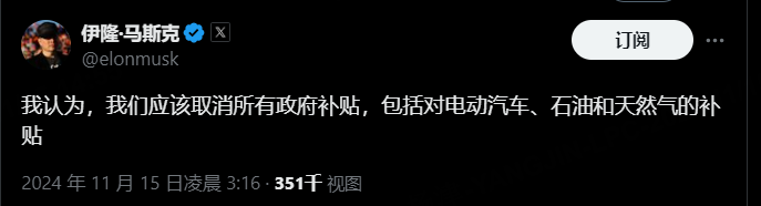 马斯克还是重申了他3年前的话,取消对所有汽车的所有补贴,不过这一次强调了所有汽车,包括燃油车,都得取消补贴。对传统能源车更不利,对自己就有利?马斯克对电车市场需求这么有信心吗? $特斯拉(TSLA)$