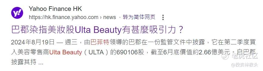 8月19日,一则消息称巴菲特买入了美容零售商Ulta(犹他美容),当时我还写了一篇《被巴菲特盯上的ULTA美妆,到底是个什么东西?》,对犹他美容做了一番分析。