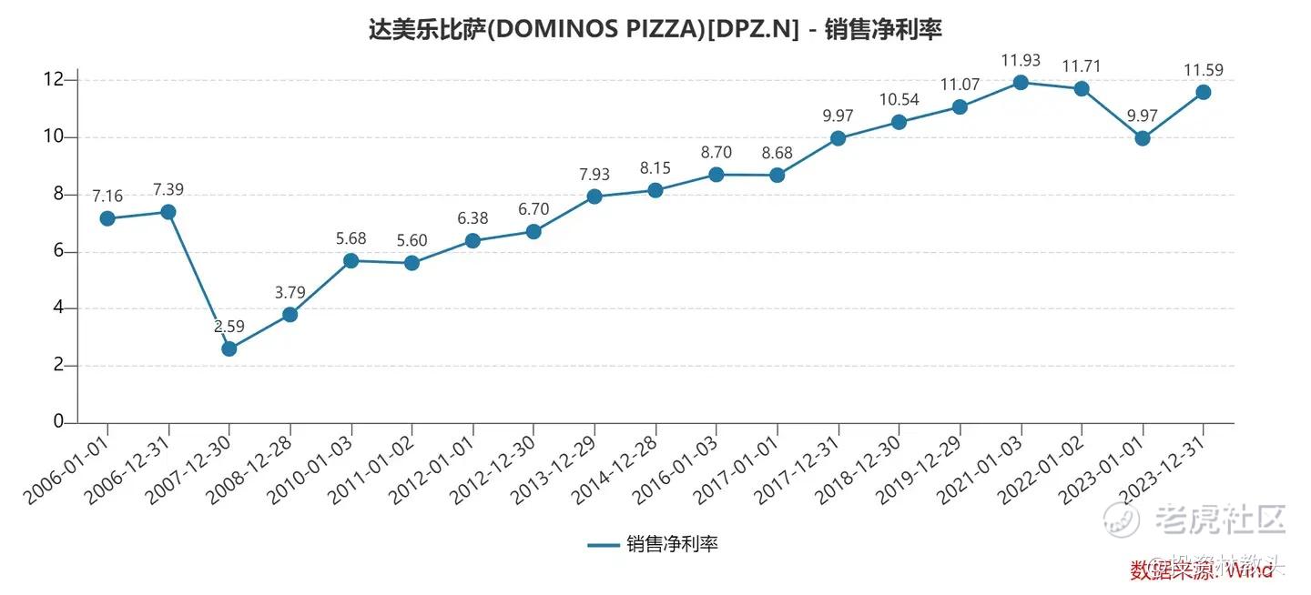 作为一家消费品公司,达美乐的净利率可以站上10%,而且连年增长,这是非常好的业绩,呈现出一种越来越强的盈利能力。别小看10%的净利率,在消费品这个领域,这非常难得。