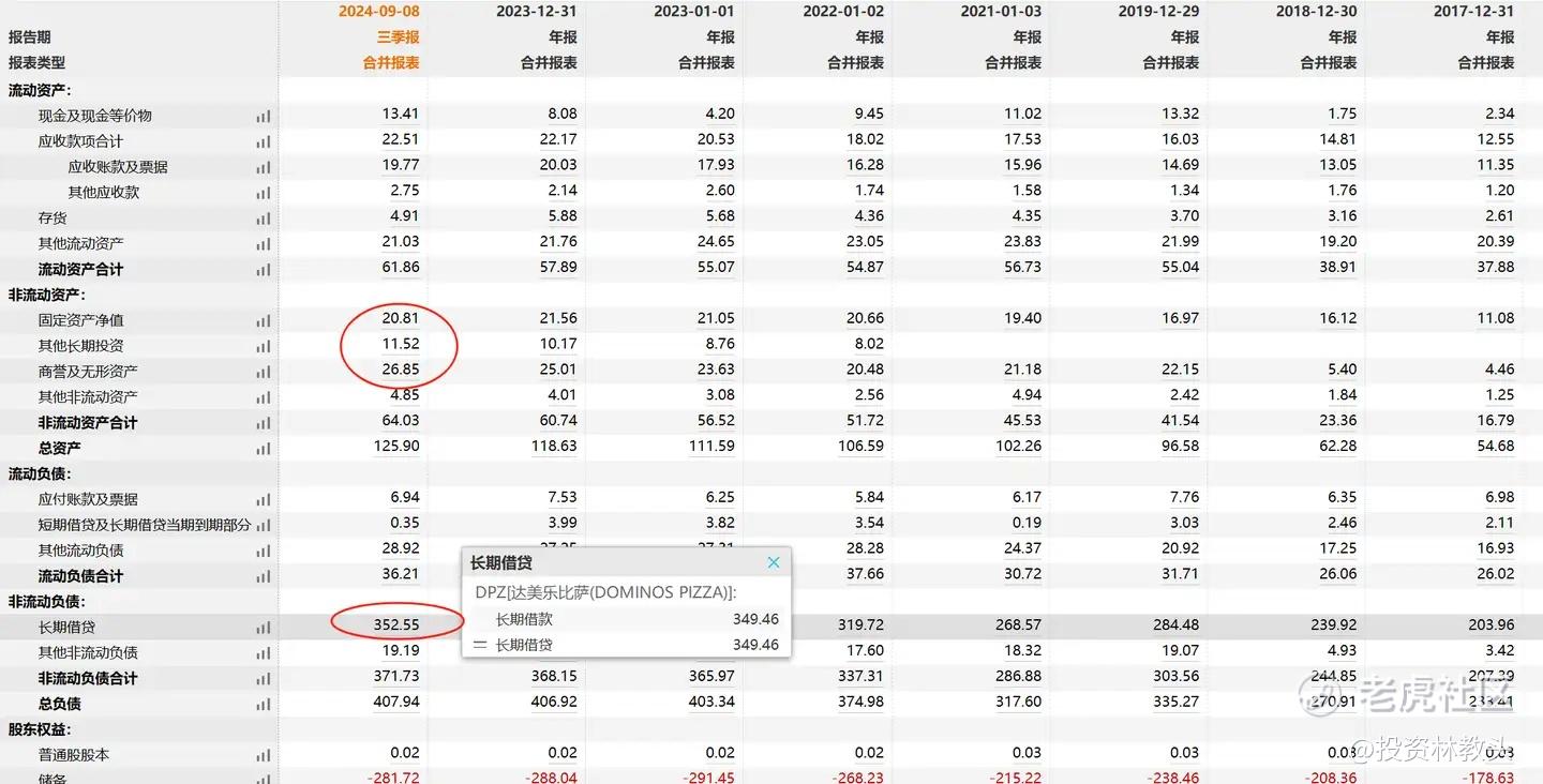 从资产负债表来看,比较不能理解的是长期借贷贼多,高达352.55亿元,其次是固定资产、商誉、无形资产等,这也符合达美乐这家公司的特点:门店多,固定资产多。借款太多可以理解为扩张需要,因为门店的扩张是偏重资产的,对于一家有价值的公司来说,债务融资比股权融资要好,因为股权更可贵,没必要稀释。