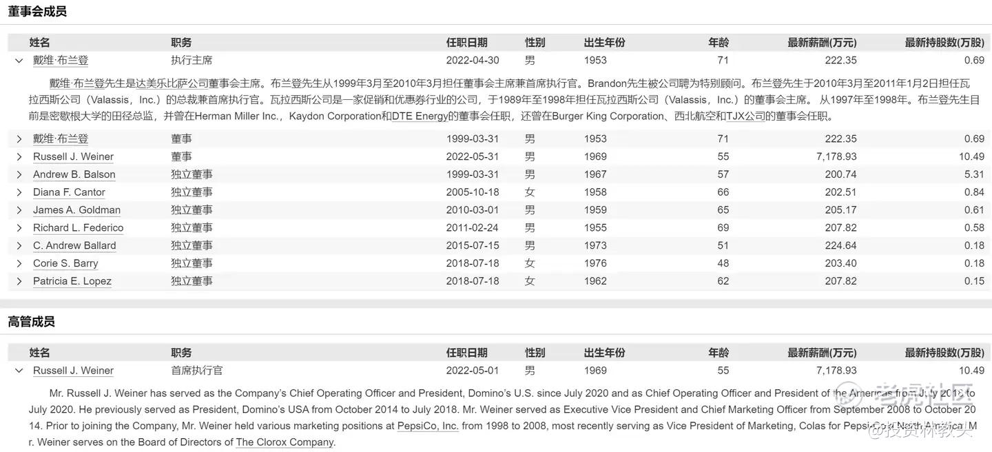 以下是达美乐的董事长和高管资料,但不是什么名人,网上查了一下戴维·布兰登,搜索结果却只有篮球运动员“布兰顿·戴维斯”,课件布兰登的低调。不过从Wind上看,布兰登在瓦拉西斯公司担任过CEO,这是一家促销和优惠券行业的公司,也就是董事长确实有足够丰富的行业经验。