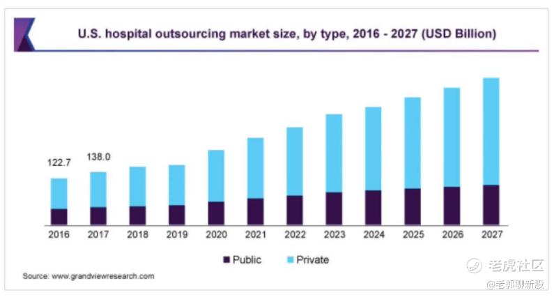 Grand View Research估计,2019年全球医院外包市场规模为2710亿美元,并预计从2020年到2027年,将以10.4%的复合年增长率增长。