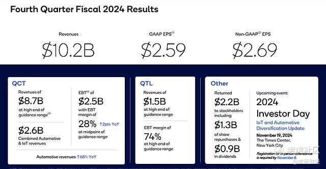 从 24 财年来看,高通的营收同比增长 9% 至 389 亿美元,每股收益增长 21% 至 10.22 美元。
