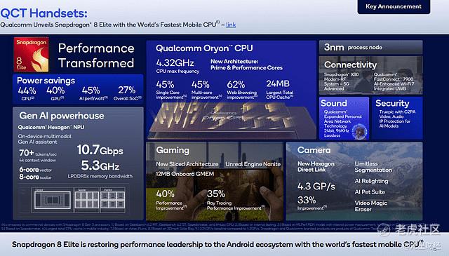 与上一代骁龙 8 Gen 3 系列相比,该 CPU 性能提升高达45%,功耗降低 44%,可无缝处理多模式 Gen AI 的复杂性,同时优先考虑隐私。