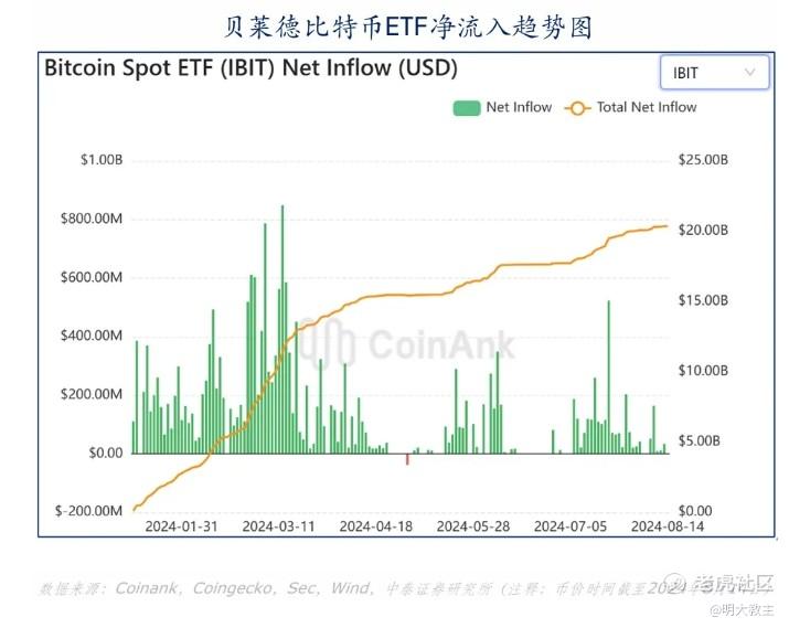 中泰证券统计数据显示,截止8月14日,贝莱德IBIT比特币ETF净流入205.5亿美元,美国全部发行的比特币ETF规模已达531.1亿美元。