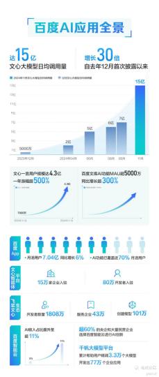 到2024年11月,百度飞桨及文心生态已经汇聚了1810万开发者,相比6月末的1470万,增长了340万之多。文心系列模型的日均API调用量更是达到了惊人的15亿次,与8月的6亿次相比,实现了大幅增长;这一数字是去年四季度披露的超5000万次的约30倍。