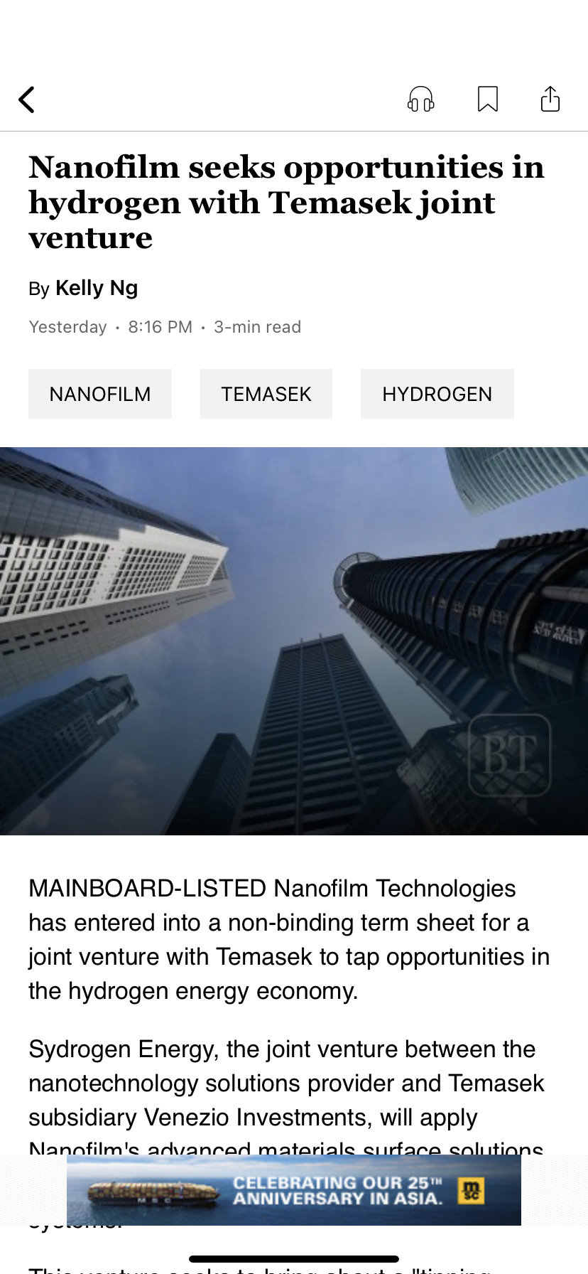 Sydrogen Energy, the joint venture between the nanotechnology solutions provider and Temasek subsidiary Venezio Investments, will apply Nanofilm's advanced materials surface solutions to critical components in fuel cell and electrolyser systems. (Source business time 19 april 2021)