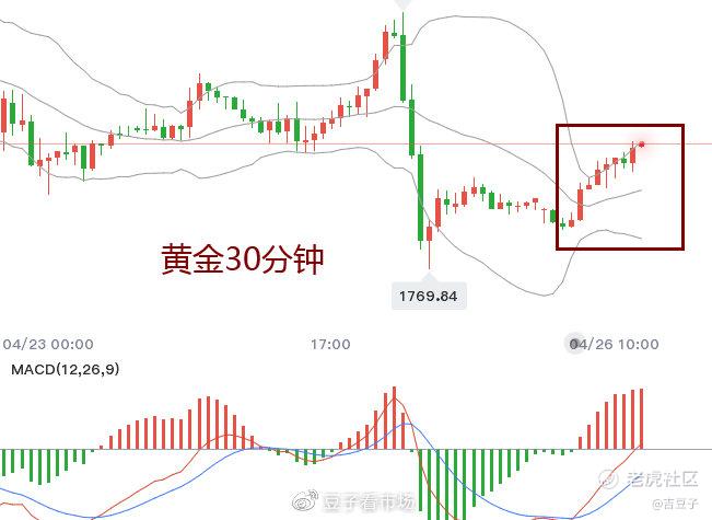 图为黄金30分钟。今天早盘的单边的确很唬人,macd的多头放量也很猛,现价1782,k线下影线明显,但还是上行,买盘占上风,预计日内会继续震荡上行,但不建议做多,除非4小时确认出现反弹信号,那也要到欧盘时间了。不得不说日线中还是有上升空间的,但布林带上轨也就在1803附近,且很明显上行势头在放缓,1800是可以坚信的,但日内是不太可能的。上午直播说到,日内关注1787附近的阻力,在83-87位置都可以尝试短空。