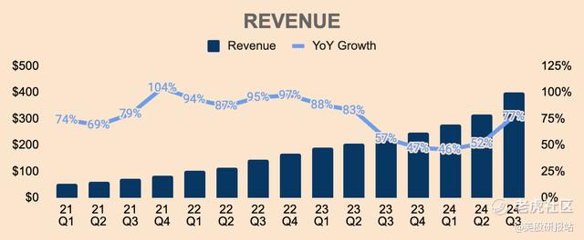 · 2024年第三季度收入达4.02亿美元,同比增长77%,增速较前两个季度加速。