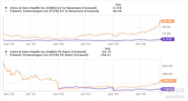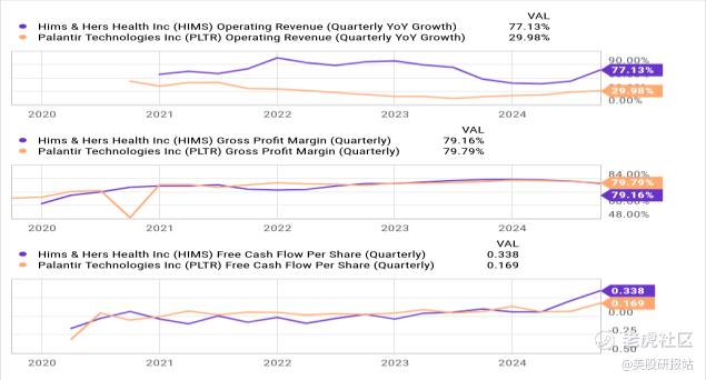 o 市销率为 46倍,尽管HIMS的毛利率和自由现金流表现均与Palantir相当。