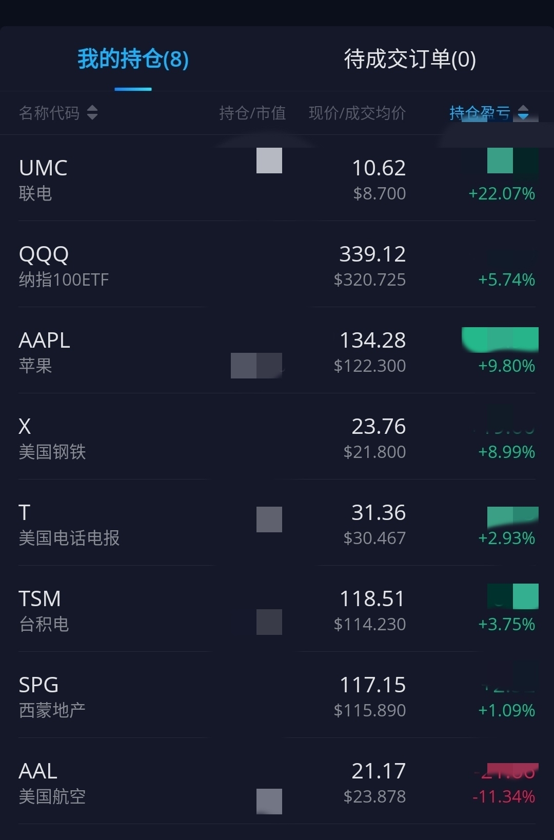 除了$美國航空(AAL)$目前是虧損之外,其餘的皆是浮盈。