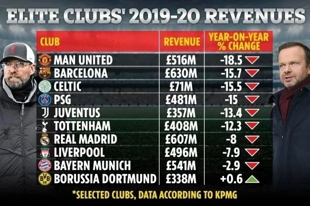 毕马威会计事务所周四公布《欧洲冠军报告》,透露了 2019-20 赛季欧洲各大豪门的经营情况。令人震惊的是,20 家欧洲豪门亏损高达 10 亿英镑,其中曼联营收缩水 1.1 亿,而米兰则亏了 1.73 亿,特别是巴萨,2020 年将有 5 亿多债务需要偿还之外还有 4 亿多账面债务需要处理。