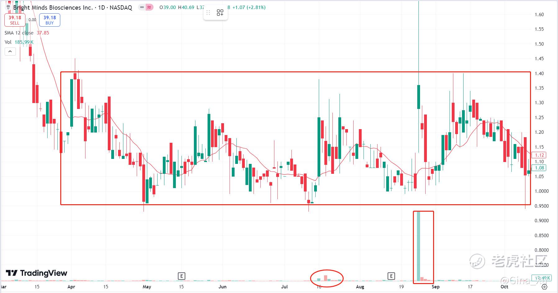 回顾$DRUG的走势,今年4月至10月初,它的股价长期运行在一个标准的矩形震荡区间内,成交量虽然时有波动,但始终未能突破。