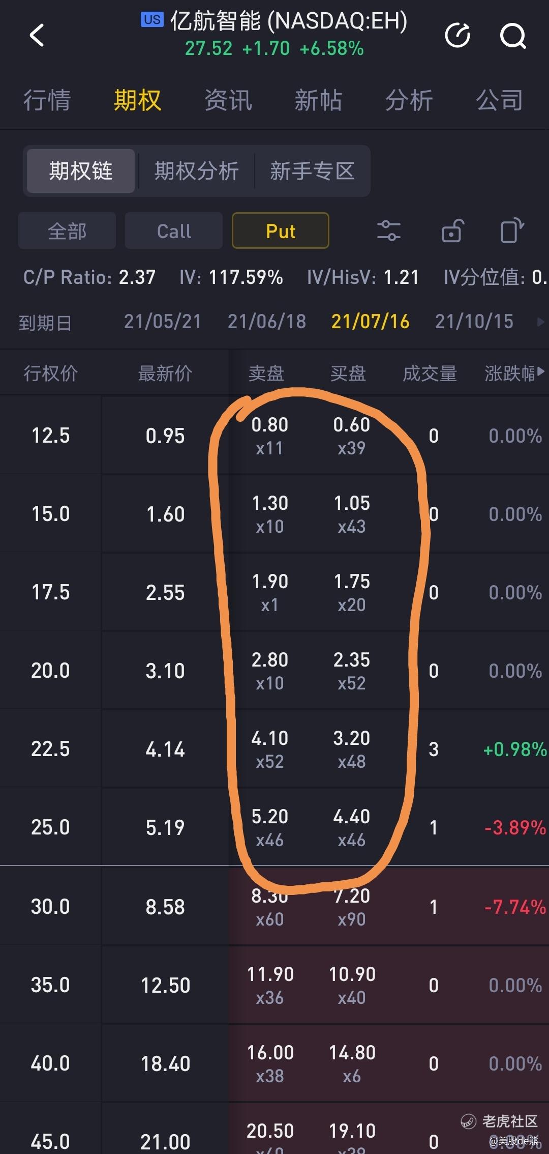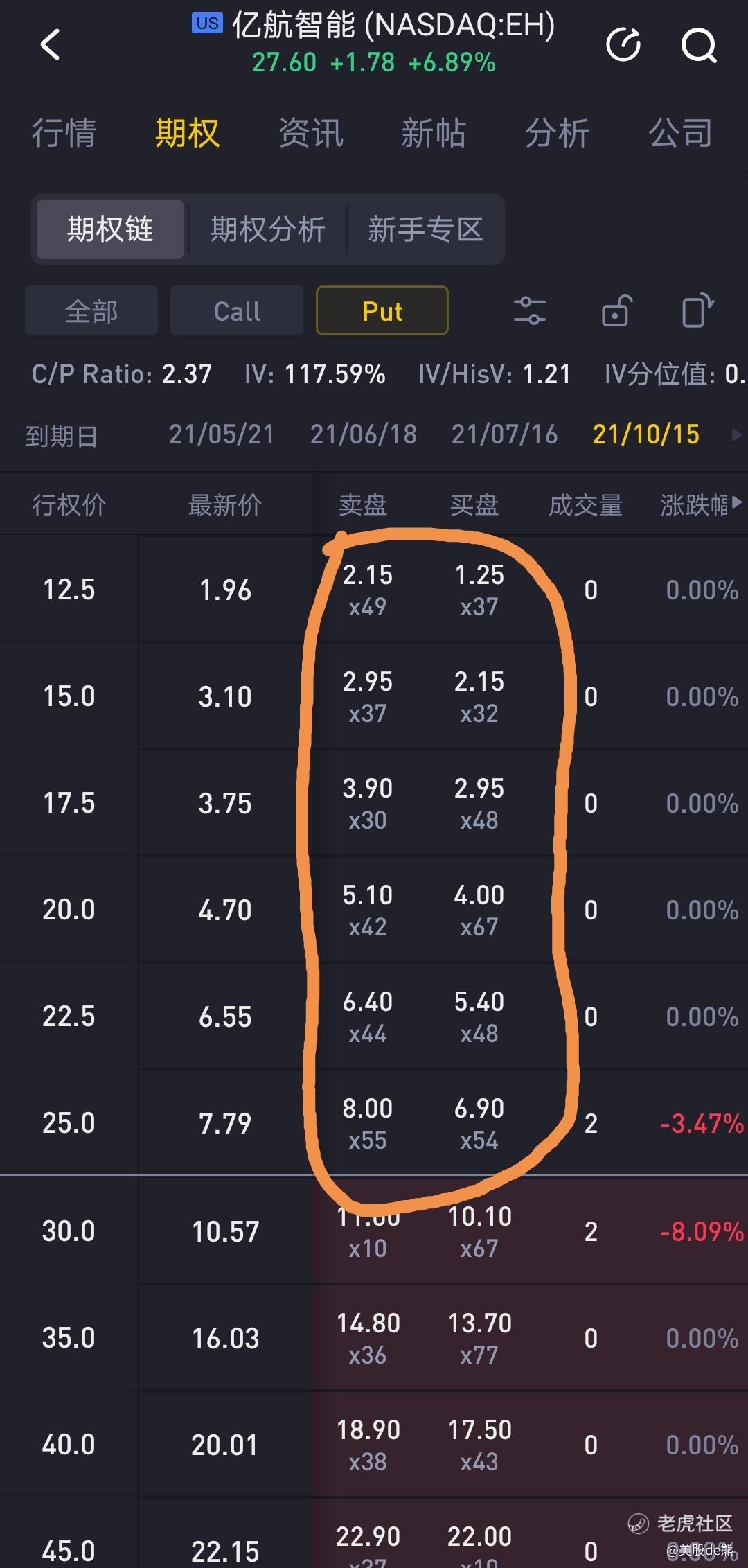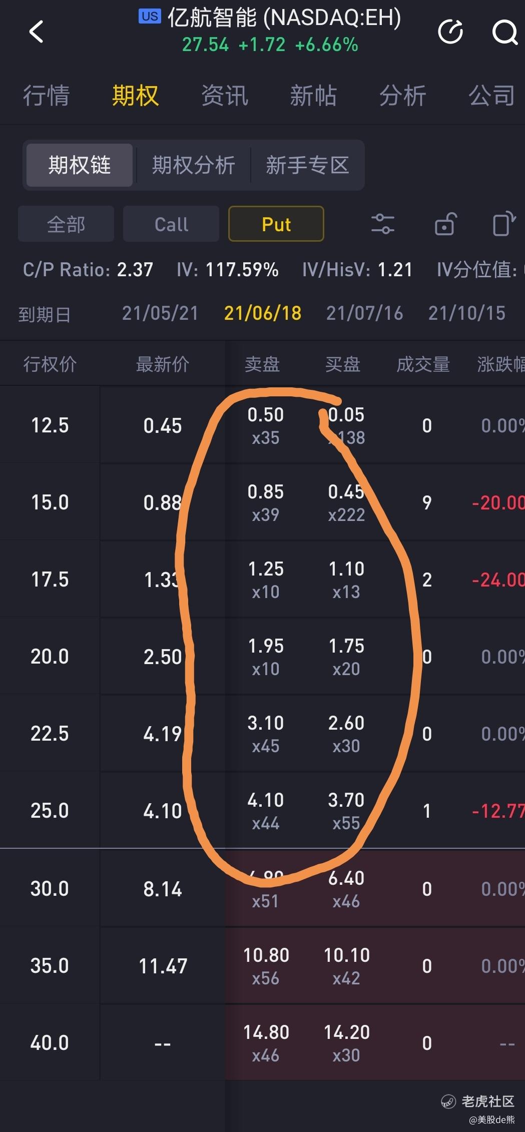 $亿航智能(EH)$通过看put期权未来三个月的定价,可以看到玩家对这票的预期基本上在20以下,股de熊并没有这么乐观,认为大概率会跌穿10块,在此打个卡,等着回头看(不少做多的韭友每次都想看股de熊打脸,但自打从100以上到20多,每次股de熊都用事实赠予sha韭们这种大bi斗)