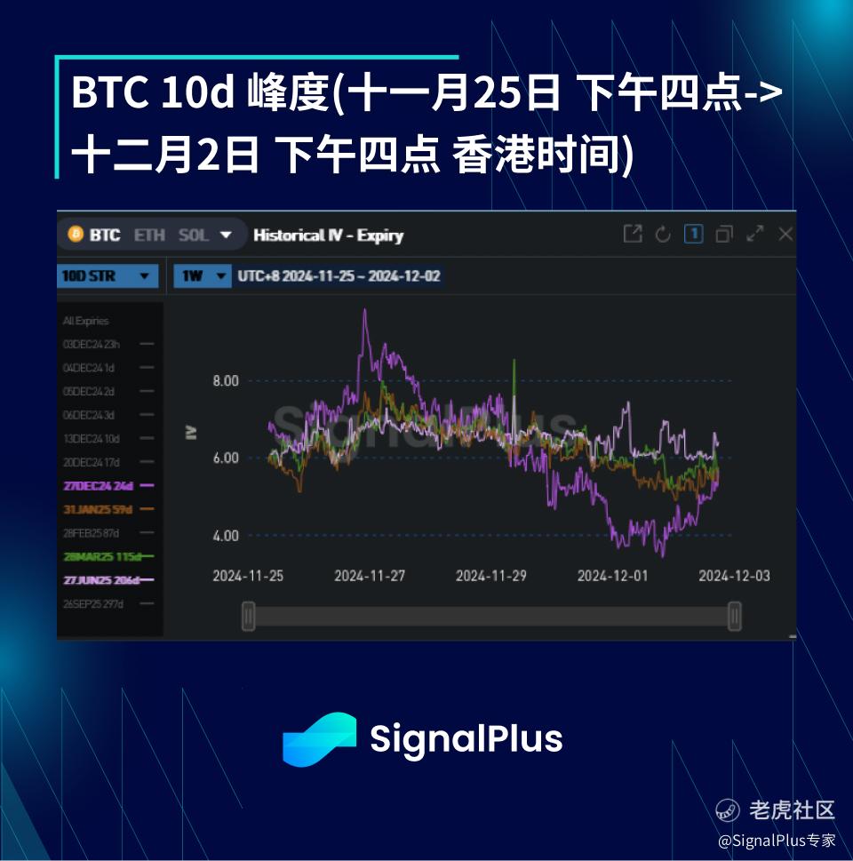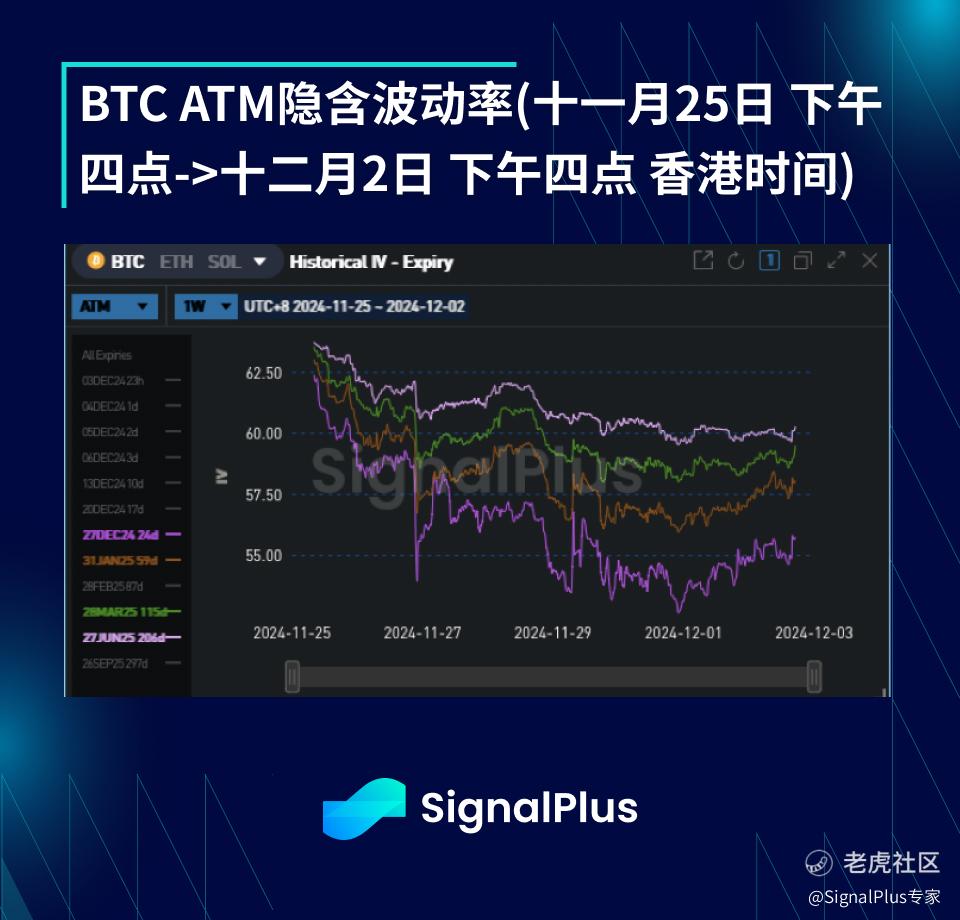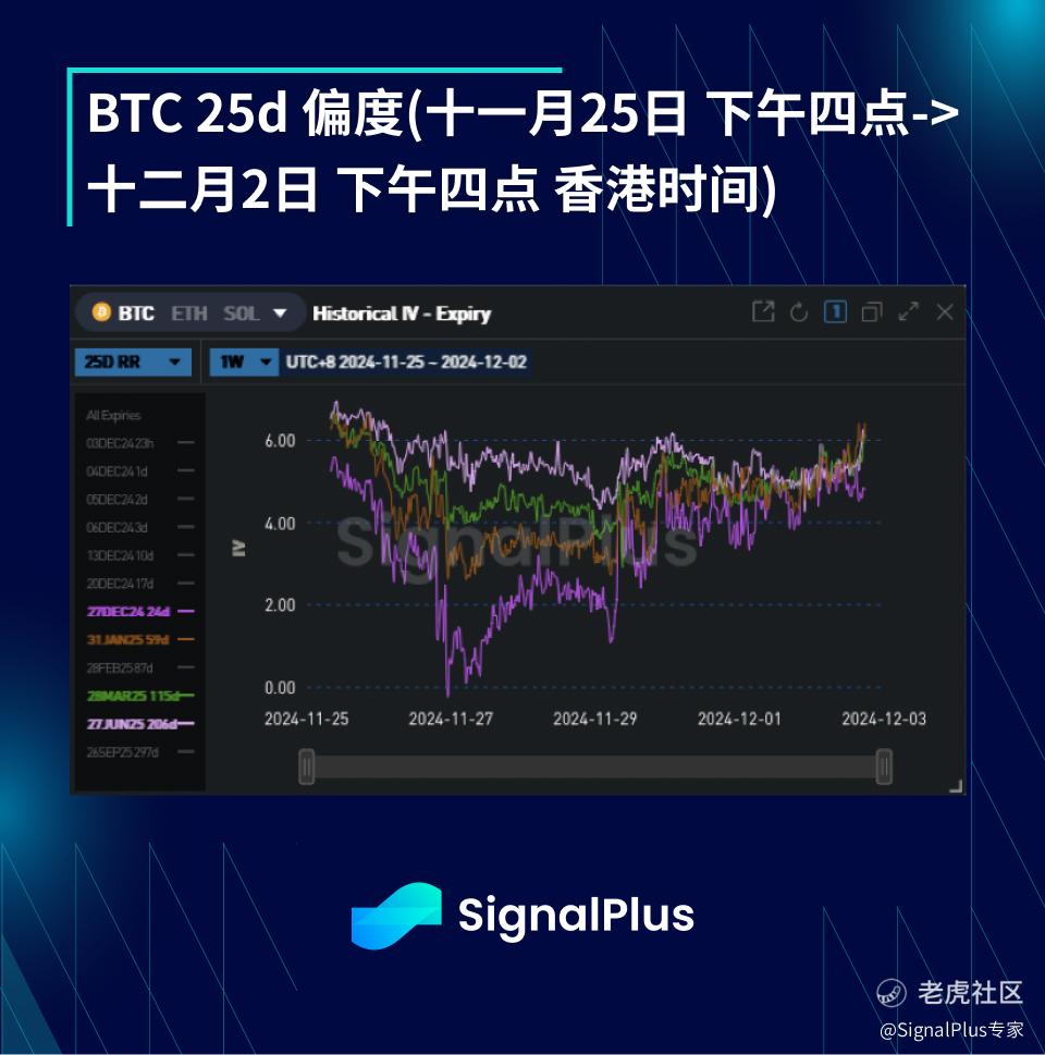BTC 对 USD 年底(十二月)ATM 波动率下跌 4.2 点(60.0->55.8),年底 25 d 偏度保持不变(4.9->4.9)