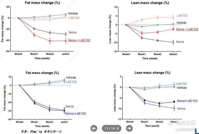 来凯医药公布的临床前DIO模型(饮食诱导肥胖模型)数据显示,LAE102对瘦体重(Lean mass)增加呈现出了明显的效果,而公司另一款ActRIIB选择性抗体LAE103亦展出瘦体重增加的疗效,且LAE102疗效更强;在联用司美格鲁肽的DIO模型中,LAE102展现出了强劲的效果。这些数据结果都在扎实的支撑LAE102一跃成为赛道潜在同类最佳分子。