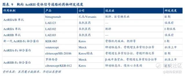 目前,全球进入临床阶段靶向ActRII受体的药物仅有礼来的Bima和来凯医药的LAE102,其余在研临床管线均靶向ActRII配体。研究表明,阻断ActRII通路能抑制肌肉的萎缩,而ActRII的多个配体包括都被证明是骨骼肌负调控因子,阻断受体的策略比只阻断单类配体的策略在机理逻辑更加通顺,疗效大概率更加有效。