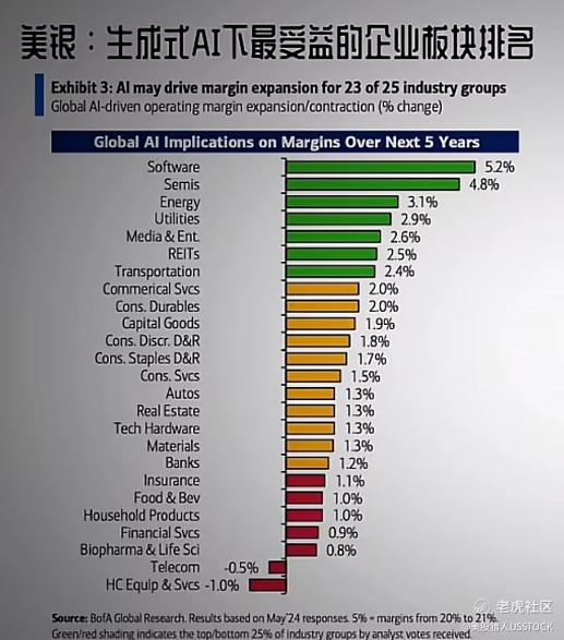 下图是美银总结的在声称是AI的浪潮下最受益的企业板块排名,排名第一的是软件公司。