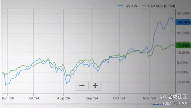 而这张图则是软件公司IGV和S&P500的表现。可以看到,从11月份起,软件股的股价突然就出现了明显的分化式上涨。