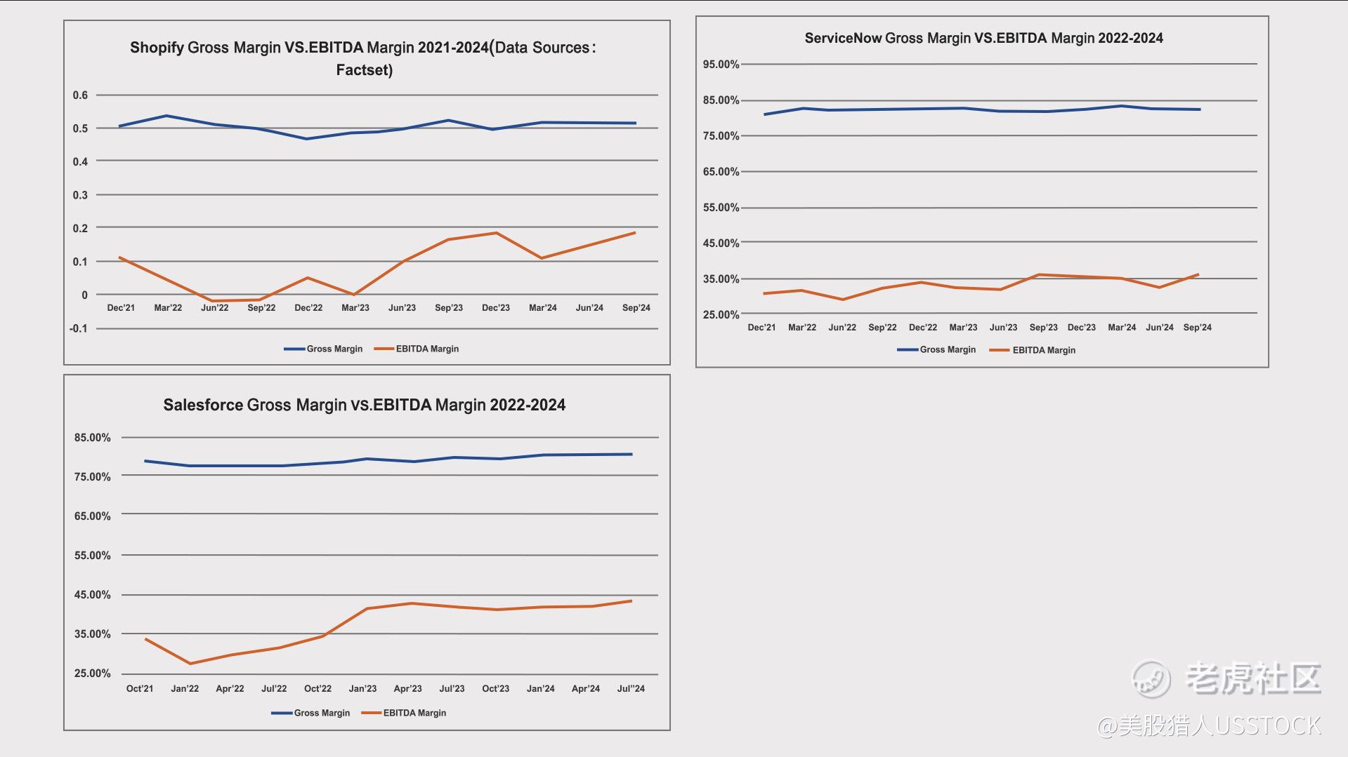 这三张图分别是Shopify、Salesforce、ServiceNow这三家典型的软件公司的Gross Margin和EBITDA Margin的对比。