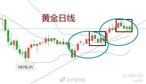 先看黄金日线。圈住的部分是从1678筑底后的两波上涨,框住的部分非常相似,都先是1中阳线和1中阴线的组合,之后再在这两根K线实体下方搭建平台盘整。前面的行情在经过三日盘整后一根强阳拉上来破位冲出另一番天地。这也是为什么一直没有放弃多头看到1800的原因。今天日内最低跌到了74之下,但我昨晚挂的单是73和69,显而易见,还没到我预期的低位,但差不多到日线上行趋势下边缘,再跌也跌不到哪去了,不用担心。