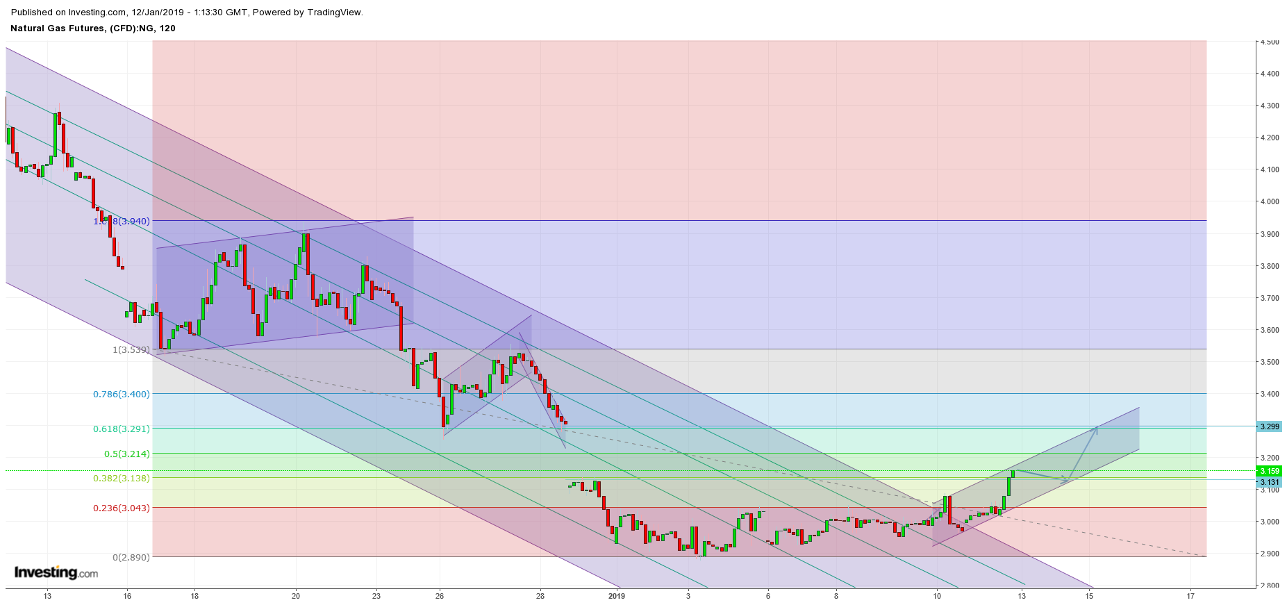 我根据基本面和技术进行交易。我相信基本面决定了方向,而技术面决定了方向。下面的图表显示的是12月17日3.539美元(1 Fib)的最低点,然后天然气几乎完全达到到3.94美元(1.618 Fib) 然后我们在1月3日处跌至2.88 (0 Fib)的低点。我们会在0.618折回吗?如果我们到那里,天然气会带我们到12月28日3.28美元!