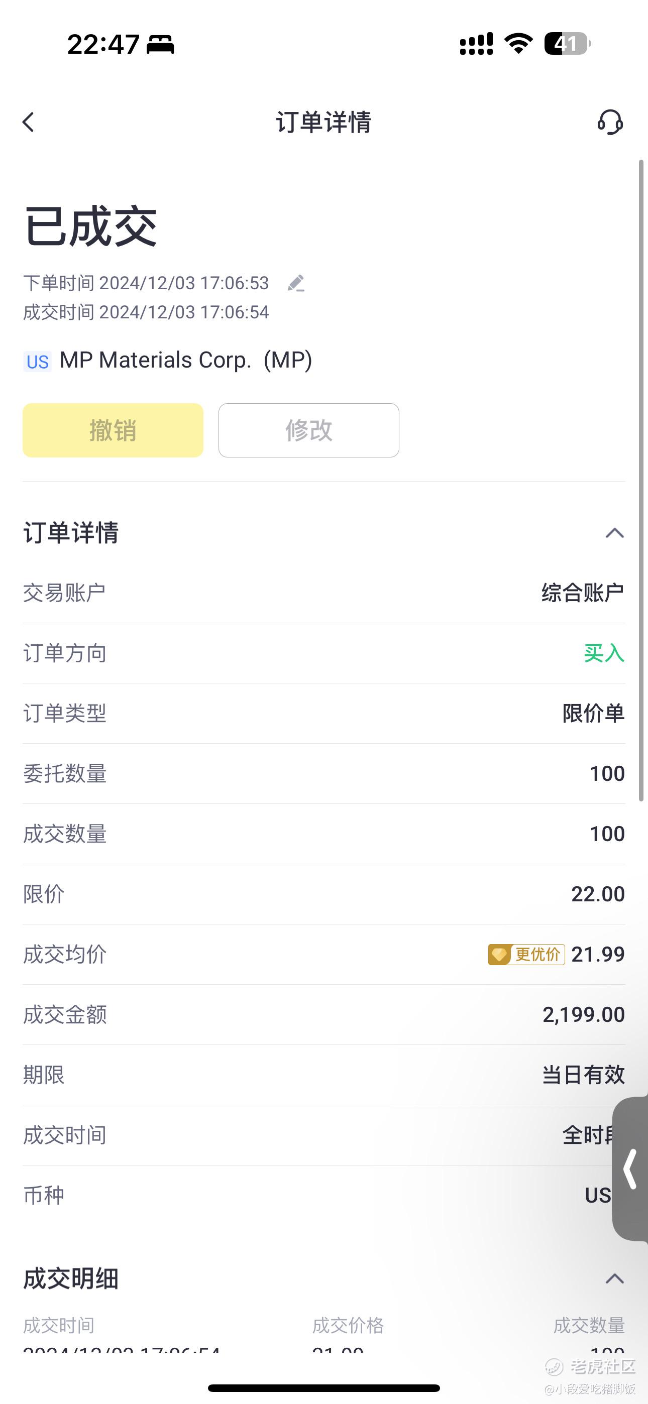 三、利用老虎全时段下单功能,以卖一价22美金成交了100股,目前盈利7%,应该可以吃几碗猪脚饭了哈哈哈哈。