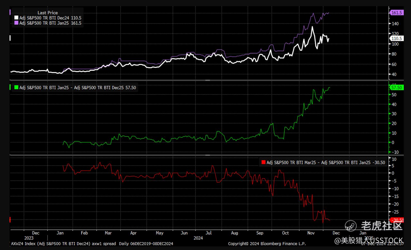 与此同时,正如上周所指出的那样,市场压力似乎仍在持续。标普 500总回报指数期货 12 月合约和 1 月合约之间的价差约为 57.5,而 3 月合约的价差则变为负值。