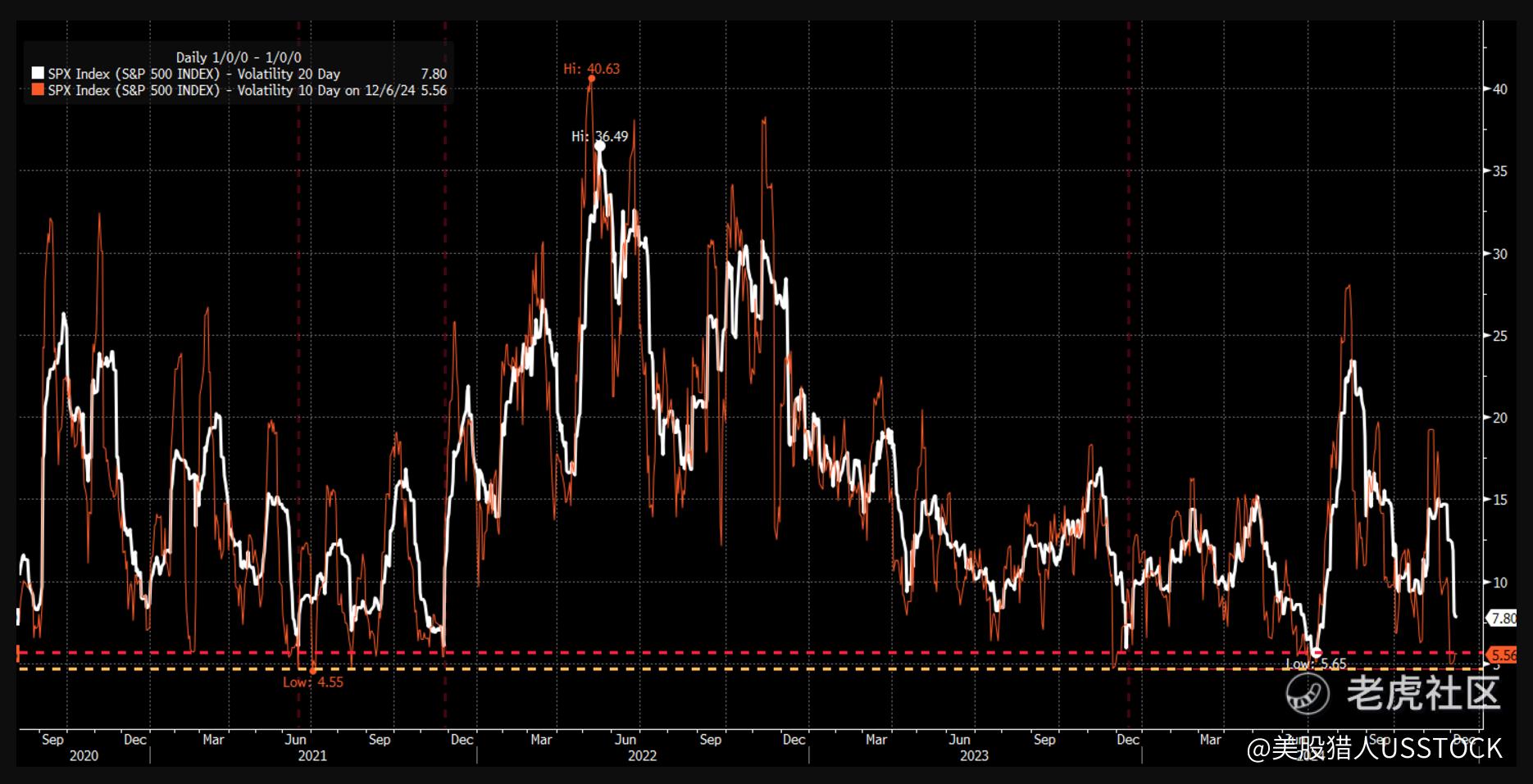 此时,10 天和 20 天实际波动率已大幅下降,至少目前看来已接近底部。这表明实际波动率可能只有一个方向——向上。