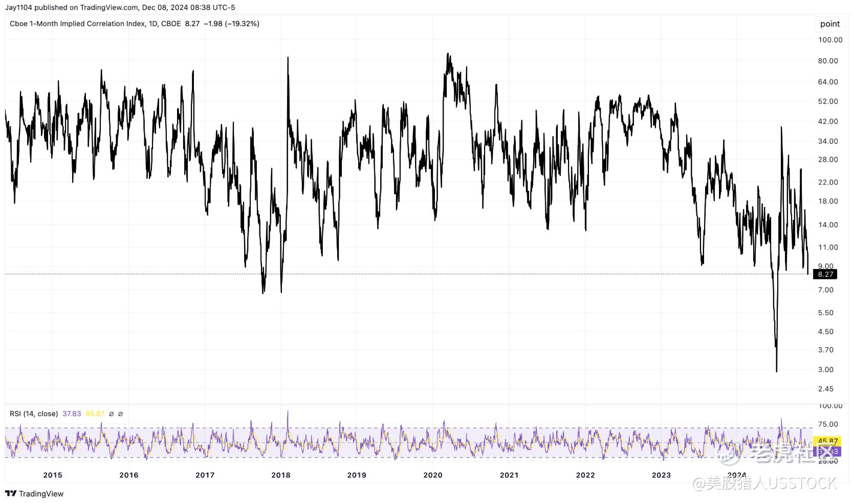 此外,1 个月隐含相关指数已跌破 10,这是历史上罕见的情况。如此低的水平仅在 2017 年末(2018 年 1 月下跌之前)和 2024 年 7 月(2024 年 8 月下跌之前)出现过。