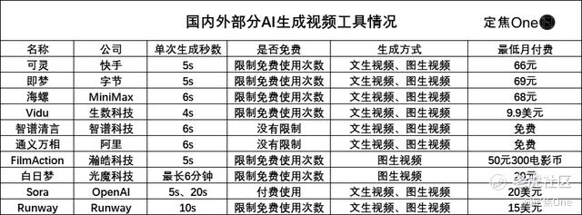 在收费上,国内的产品都可以不付费体验,有些会限制使用次数。Sora则必须付费才可以使用,且门槛不低,20美元起步,Runway其次,最低月付费15美元。